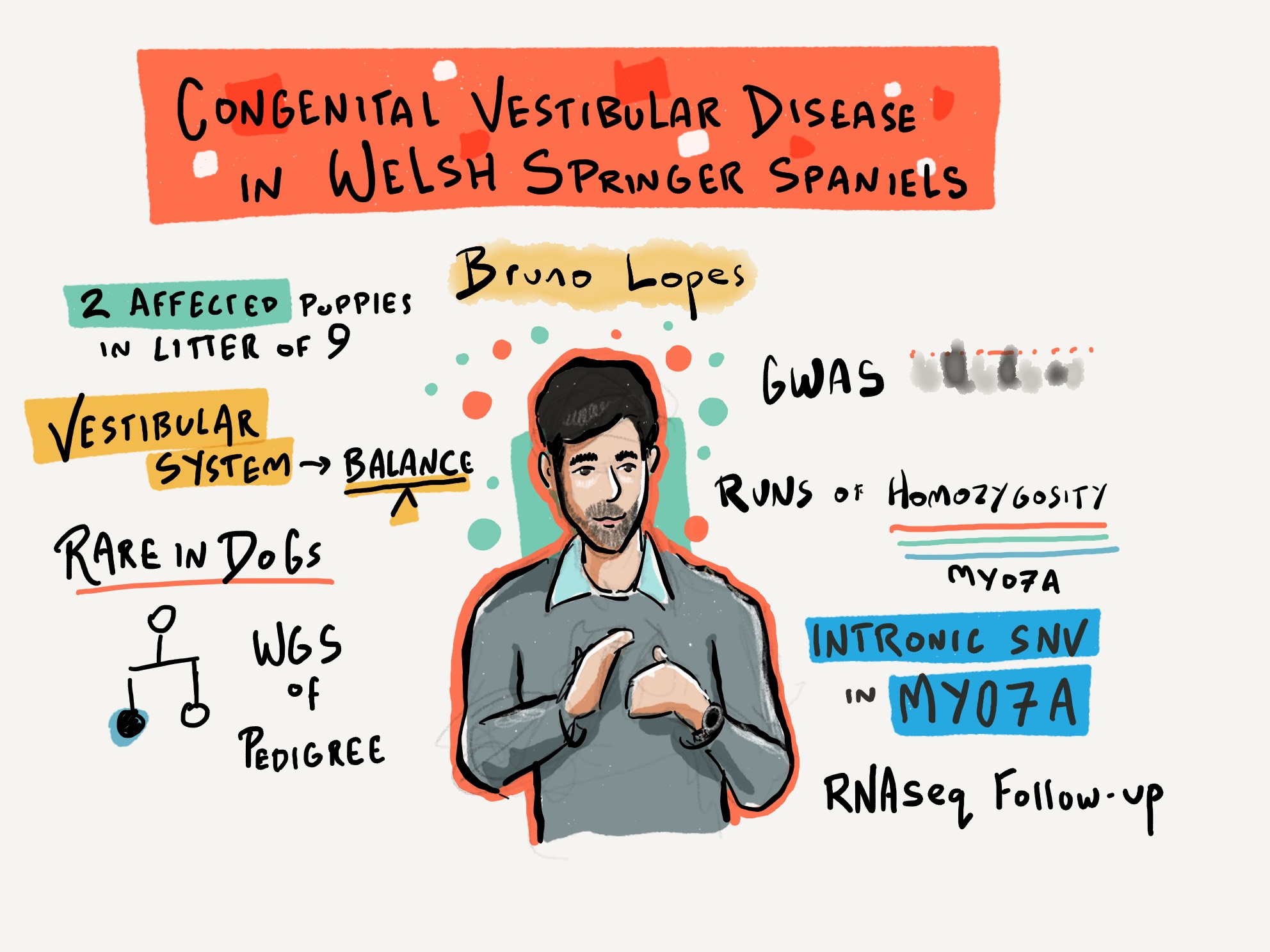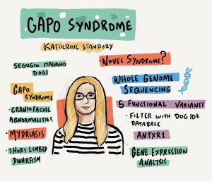 We are proud to have had presentations from two of our own – Kat Stanbury presented her recent findings in the Segugio Italiano and Bruno Lopes, our PhD student, presented our Welsh Springer Spaniel story – as well as a poster presentation (including a 5-minute flash talk) from Ellen on her Osteogenesis Imperfecta project. We were very pleased to have the amazing Alex Cagan at the event, not only providing an insightful key note talk but also showing off his incredible drawing talents, producing an infographic illustration for every talk.