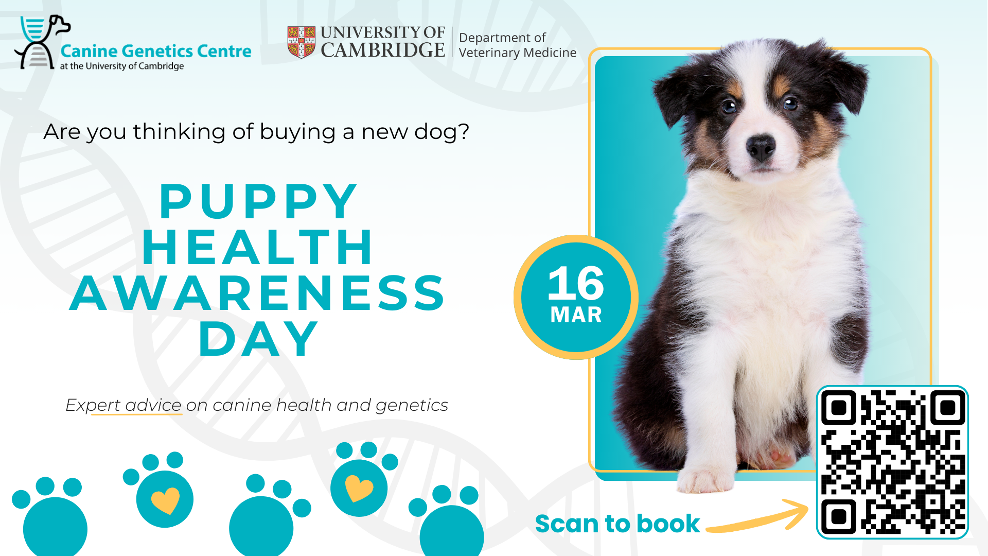 The Canine Genetics Centre (CGC) are very excited to be holding an educational day for members of the public who are thinking about buying a new puppy, in the afternoon (1pm-5pm) of Monday 16th March 2026, at the University of Cambridge’s West Hub facility.