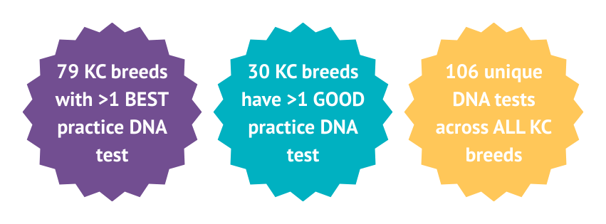 Out of 224 Kennel Club registered breeds, 88 of them have at least one DNA test listed as good practice or best practice. Some DNA tests are shared between breeds, because breeds can share the same disease mutations, and some breeds have multiple relevant tests, but overall there are 106 unique DNA tests that are relevant across UK dogs breeds.