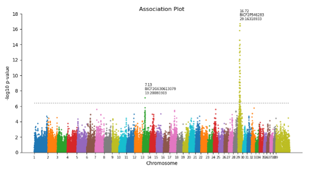The road to this discovery has been a long one and had a few bumps along the way. Back in 2022 we performed a Genome Wide Association Study (GWAS) comprising 20 RVED cases and 30 controls and the result was a “stonking peak” on chromosome 29.
