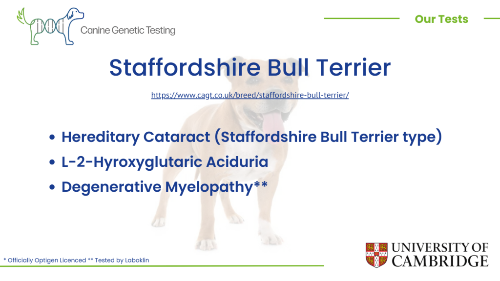 Canine Genetic Testing offers a discount on their Staffordshire Bull Terrier bundle, and until the end of December is offering a 20% discount on individual HC and L2-HGA tests as well.